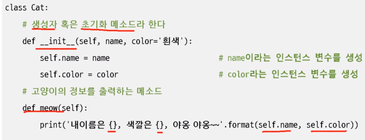 # 생성자 함수 : self = 자기참조, name,color을 매개로 전달