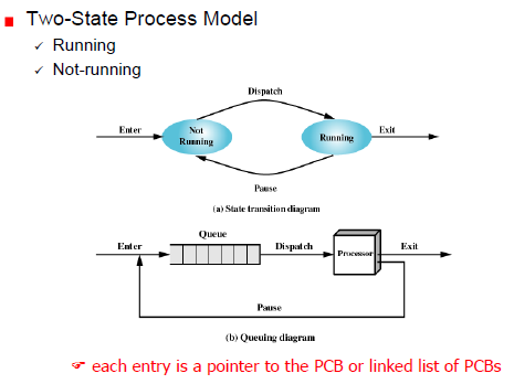 프로세스상태, 프로세스가 큐 구조 상태에서 실행되는데 실행/비실행 상태로 구성된다.