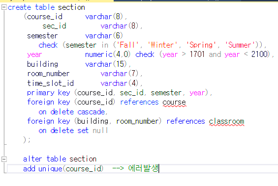 course 릴레이션에서 모든 학과 이름은 department 릴레이션의 학과 이름과 일치해야 한다.