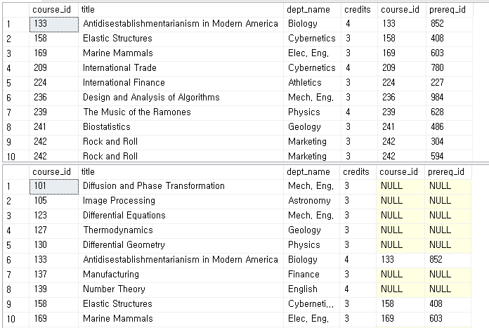 그냥 join에서 선수과목이 있는 것들을 제외하고는 NULL로 표시됨