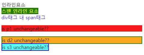 <div>인라인요소</div> <span class = "b3">스팬 인라인 요소</span> <div> <span class="classpan">div태그 내 span태그</span> </div> <p class="p1">is p1 unchangeable??</p> <div class="d2">is d2 unchangeable??</div> <span class="s3">is s3 unchangeable??</span>