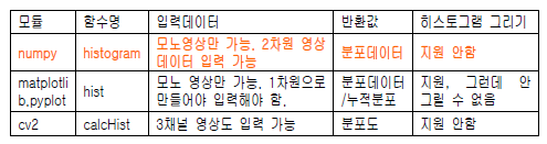 np.historgram()함수 이용. ndarray로 선언된 2차워 데이터를 입력받아서 히스토그램 데이터 반환