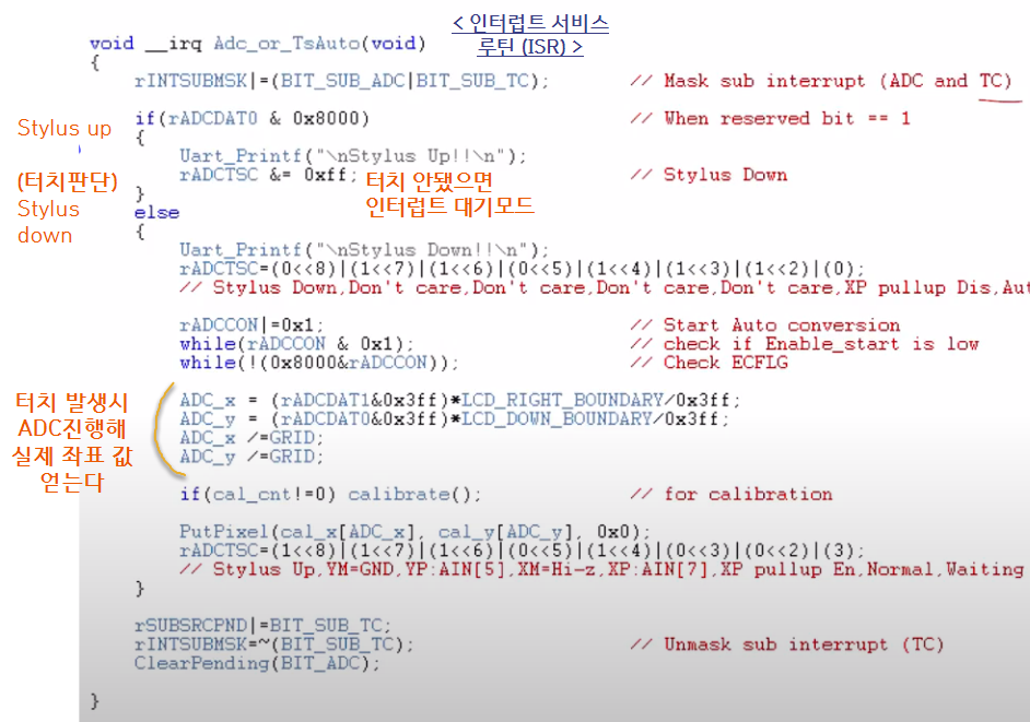 - ISR_ADC 인터럽트 서비스 루틴 ** 터치가 일어났을 때 실행하게 해주는 프로그램