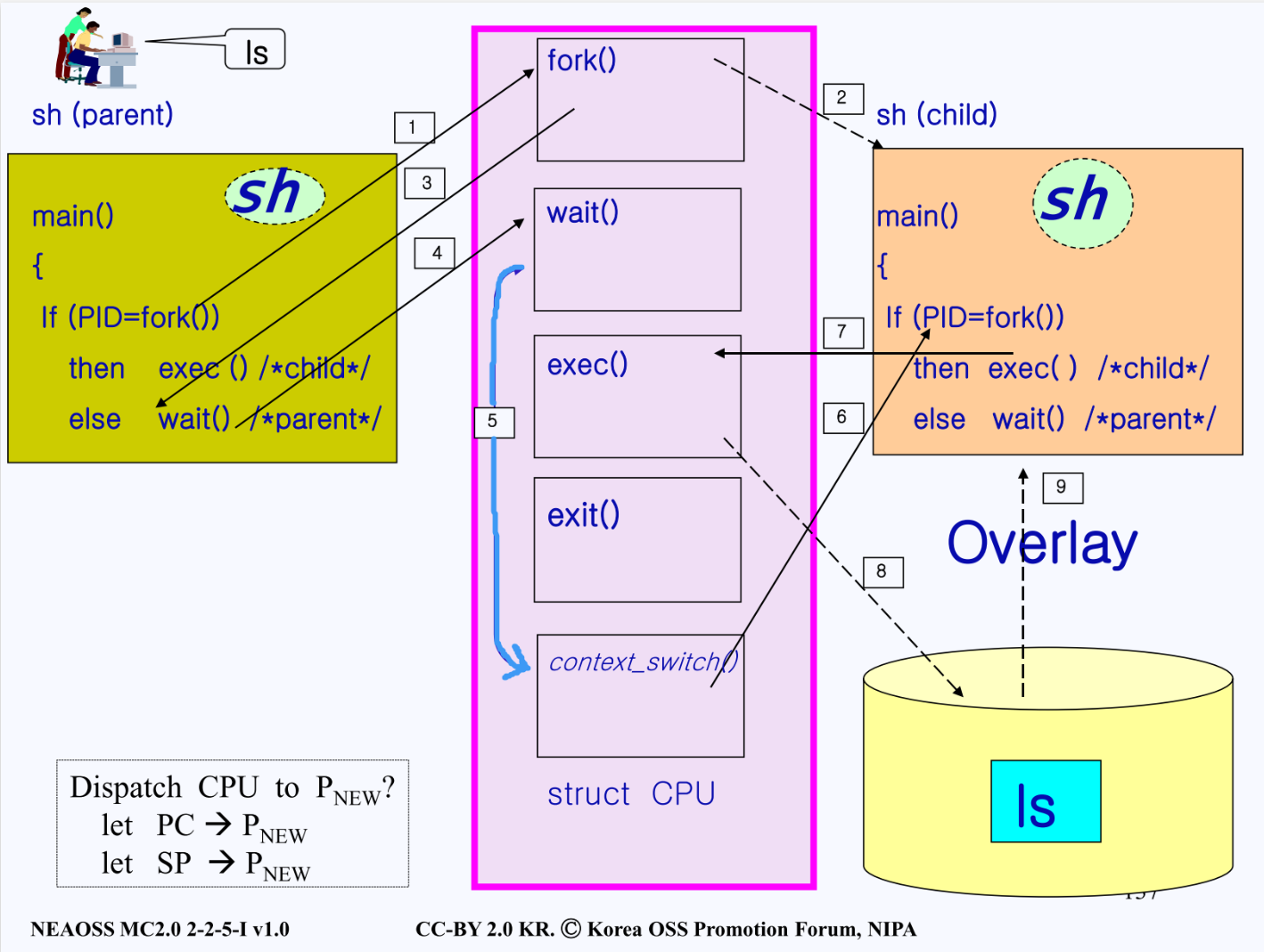 P1. 사용자의 명령어를 실행하기 위해서, fork를 통해 새로운 프로세스 생성. 부모쉘의 PCB와 쉘을 복사 (cpu가 부모쉘에 있는 상황)