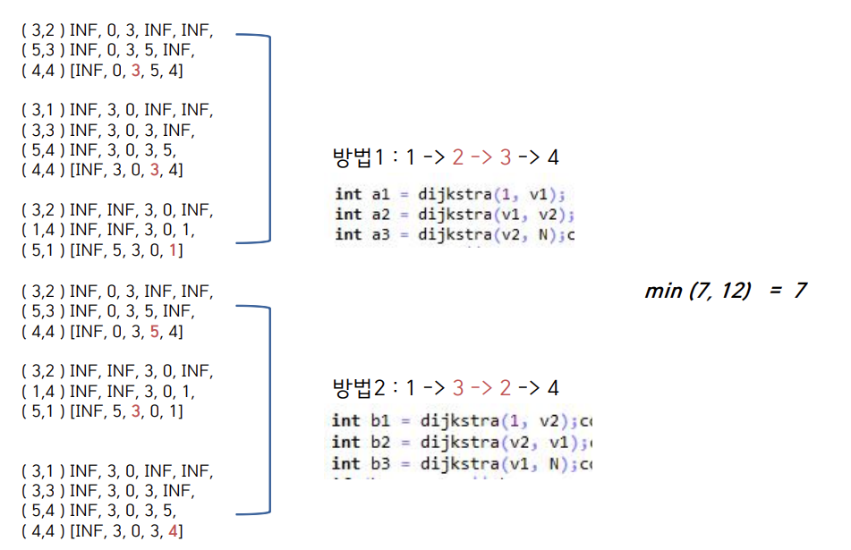 - 2,3은 꼭 지나야하는 정점이므로 정점1부터 시작해 N으로 끝나야 한다는 문제 조건에 의해 두가지 방법이 나올 수 잇다.