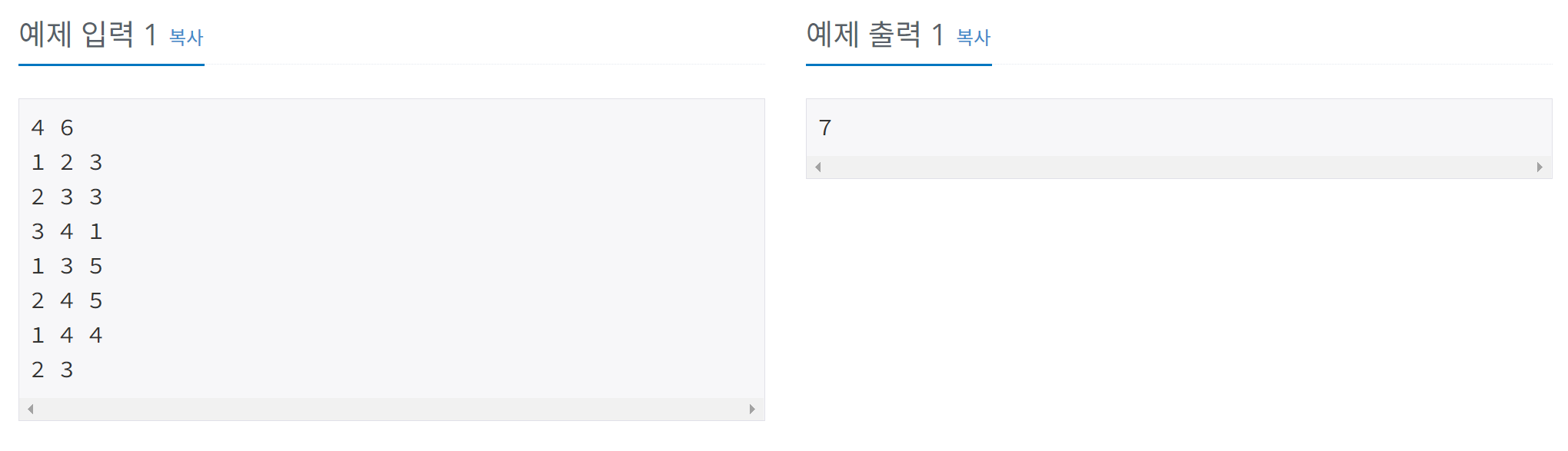 첫째 줄에 정점의 개수 N과 간선의 개수 E가 주어진다. (2 ≤ N ≤ 800, 0 ≤ E ≤ 200,000) 둘째 줄부터 E개의 줄에 걸쳐서 세 개의 정수 a, b, c가 주어지는데, a번 정점에서 b번 정점까지 양방향 길이 존