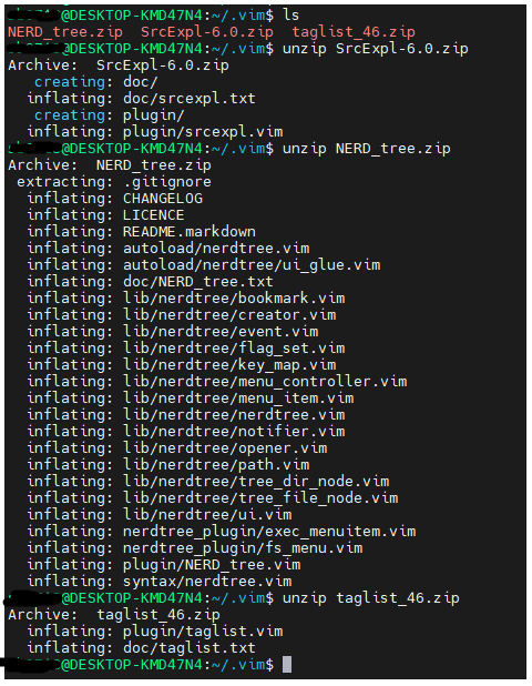 - plugin 을 홈 디렉토리 '.vim' 폴더에 복사후 unzip 명령어로 압축 해제