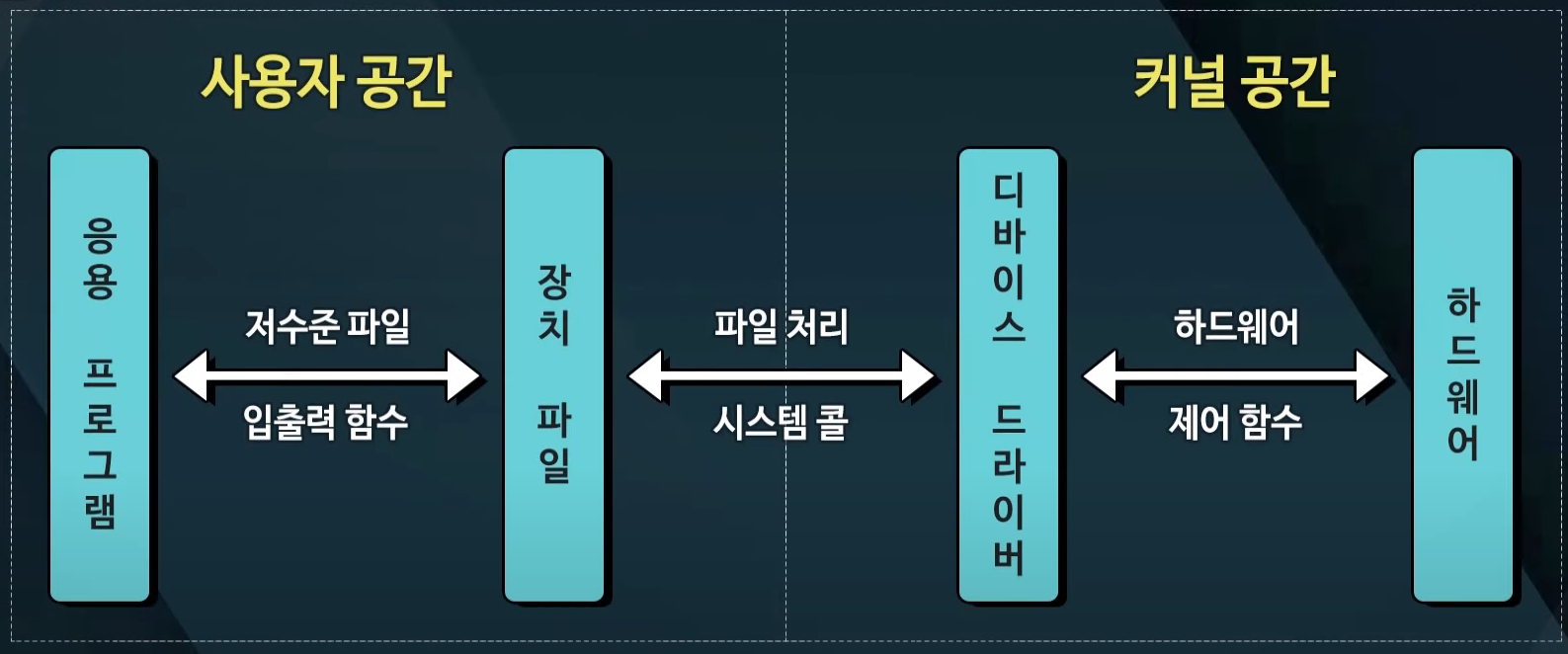 - 응용프로그램이 하드웨어를 제어하기 위해선느 디바이스 드라이버로 이동해야하고, 그 과정에서 장치 파일(저수준파일)을 거치며 쉽게 접근이 가능하도록 한다