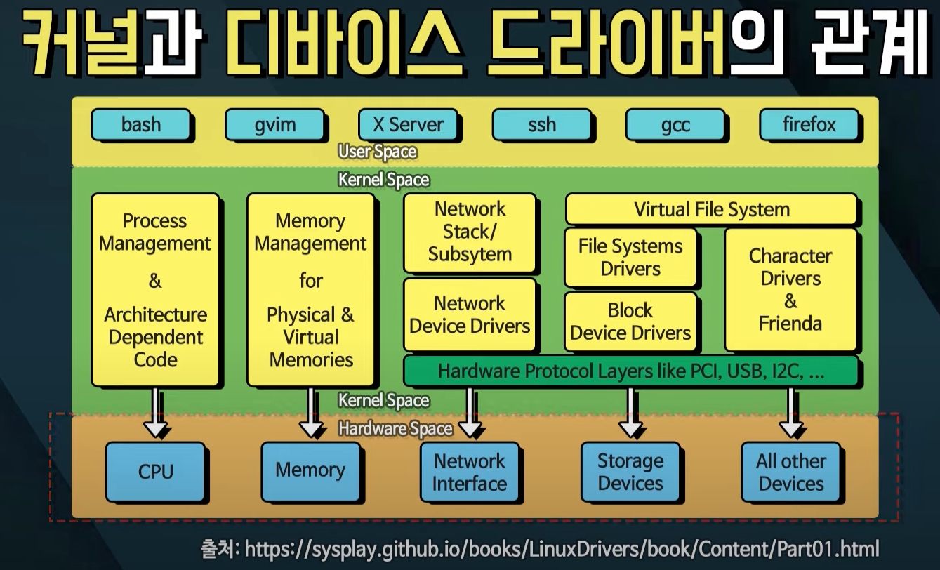 * 디바이스 드라이버 관련 개발자는 커널의 네트워크, 블록디바이스, 캐릭터 디바이스 개발이 중점