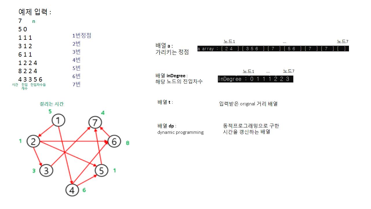 수행해야 할 작업 N개 (3 ≤ N ≤ 10000)가 있다. 각각의 작업마다 걸리는 시간(1 ≤ 시간 ≤ 100)이 정수로 주어진다. 몇몇 작업들 사이에는 선행 관계라는 게 있어서, 어떤 작업을 수행하기 위해