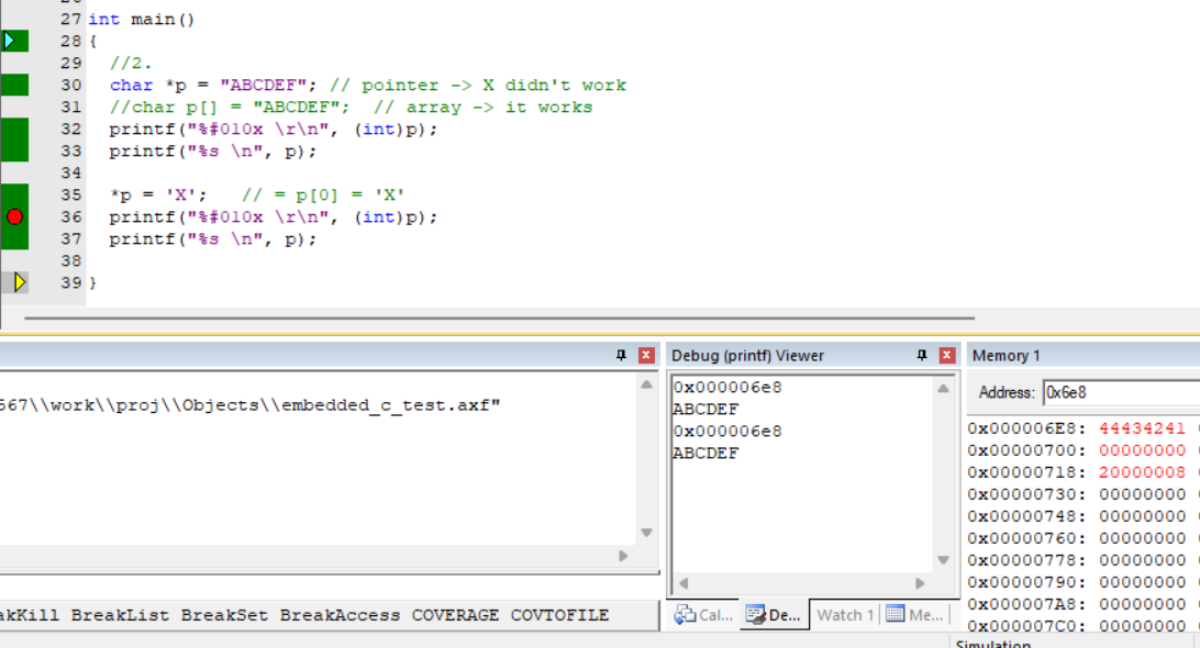 - p는 변수이므로 RAM에 저장되고, "ABCDEF"는 문자열이므로 ROM의 bin의 RO구역에 할당.