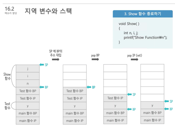 - sp가 bp와 같아지고, bp는 다음 bp까지 pop된다. 그럼 sp가 위에있고 bp가 아래있는 구조가 자연스럽게 만들어짐.