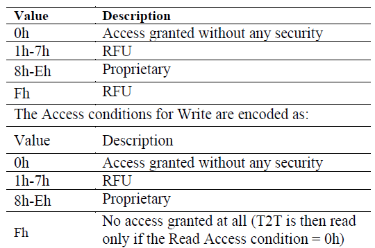 | CC_3 | Access Conditions | See descr. | NDEF Message๋ฅผ ์ฝ๊ณ ์ฐ๊ธฐ ์ํ access ์กฐ๊ฑด์ ๊ธฐ์ ํด๋์![]() ํํ ๋ฐฉ์ : ![]() |