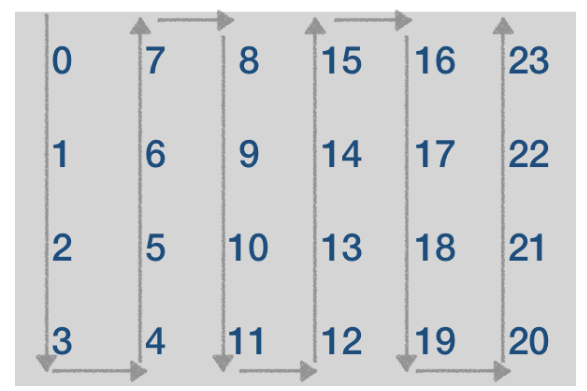 n * m크기의 직사각형에 숫자를 0부터 순서대로 1씩 증가시키며 왼쪽 위에서부터 시작하여 다음과 같이 지그재그 모양으로 숫자들을 쭉 채우는 코드를 작성해보세요.